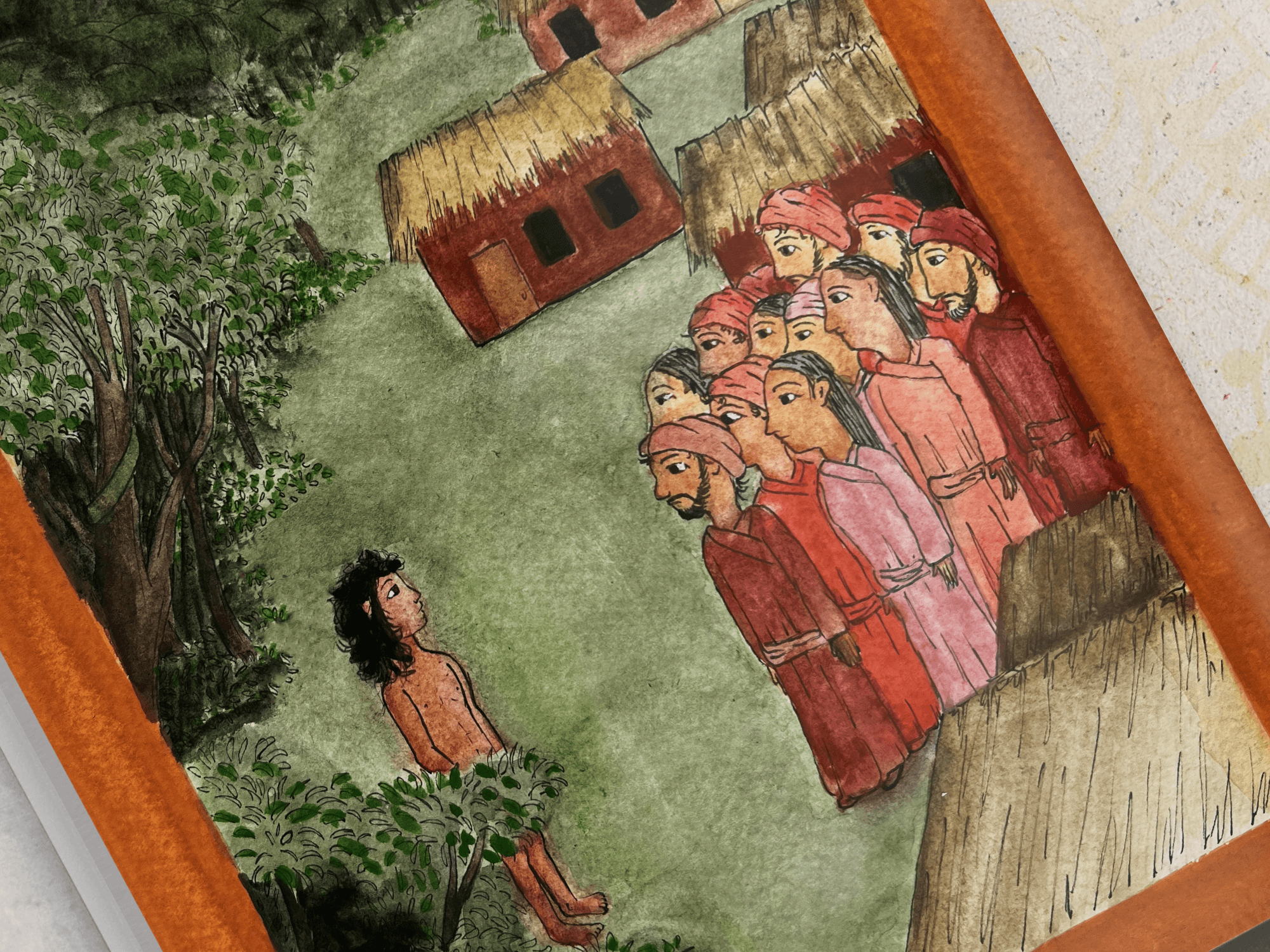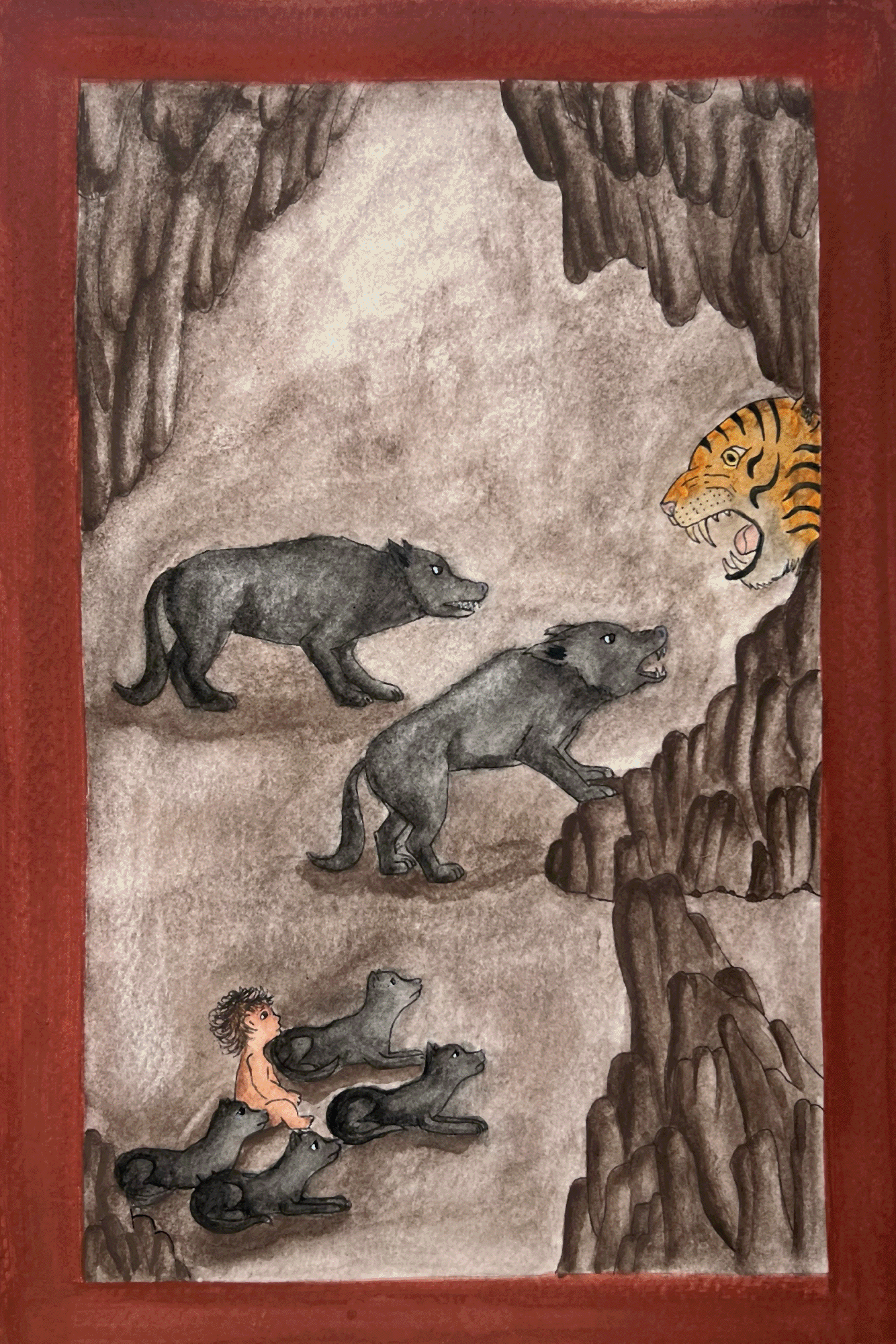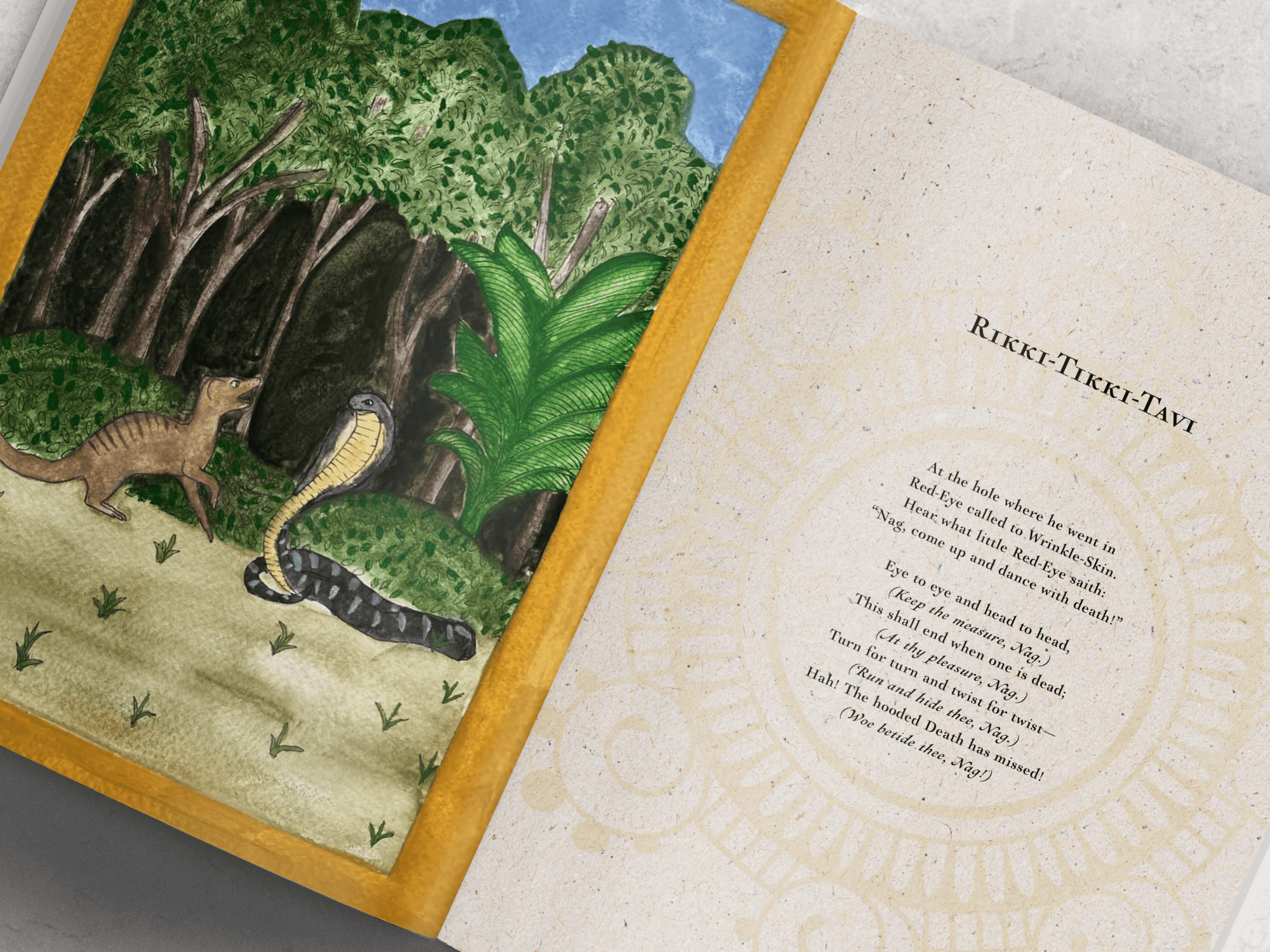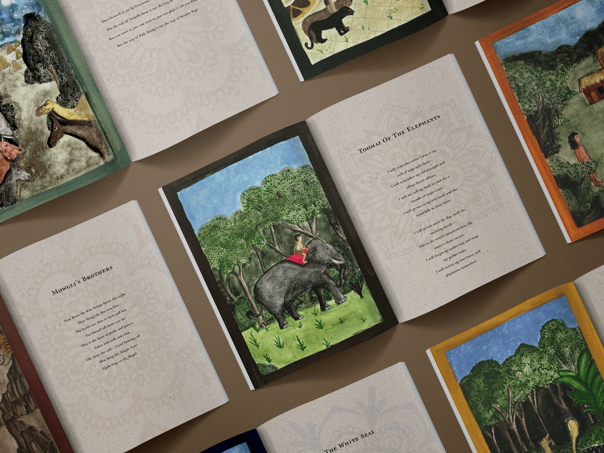 The Jungle Book redesign was a collaborative project, with my primary focus on visual development. I created chapter header watercolor paintings representing key moments in the story. The narrative is set in the forests of Central India, which informed the visual direction. I explored a traditional Rajasthani miniature painting style, using its key characteristics, borders, dense narrative compositions, and a flattened sense of depth, to ground the imagery in its cultural context and reinforce authenticity. Thank you to Wren Richards and Ana Novoa for their collaboration and contribution to the project.