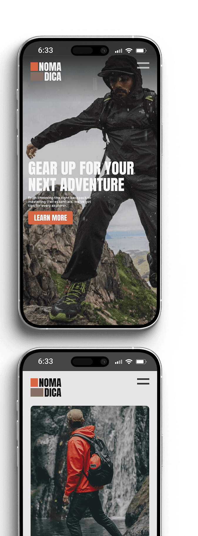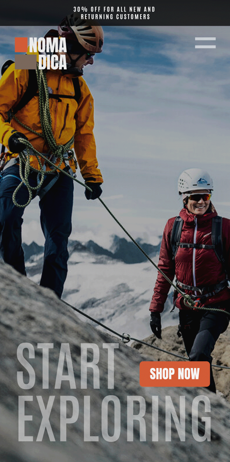 The Nomadica landing page is a hypothetical UI/UX project for an outdoor apparel brand targeting 25–40 active professionals with an outdoor lifestyle. The audience includes weekend adventurers and frequent travelers who value versatile, performance-driven gear for both outdoor and everyday use. The project combines design and marketing thinking to communicate brand identity, highlight product value, and drive engagement. The design uses a clean, modern, understated visual language rooted in a functional outdoor aesthetic.